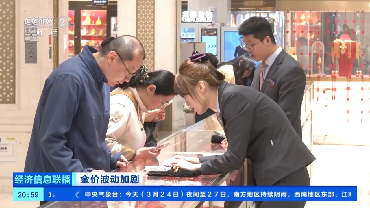 总台央视记者 王闻聪:在北京市西城区的一家金店,工作日的下午4时,这里的消费者络绎不绝,有不少消费者在现场关注实时的黄金价格,准备随时入手。在现场,购买黄金投资产品的消费者要多于购买黄金饰品的消费者。这周的客流量比上周增长了30%左右。