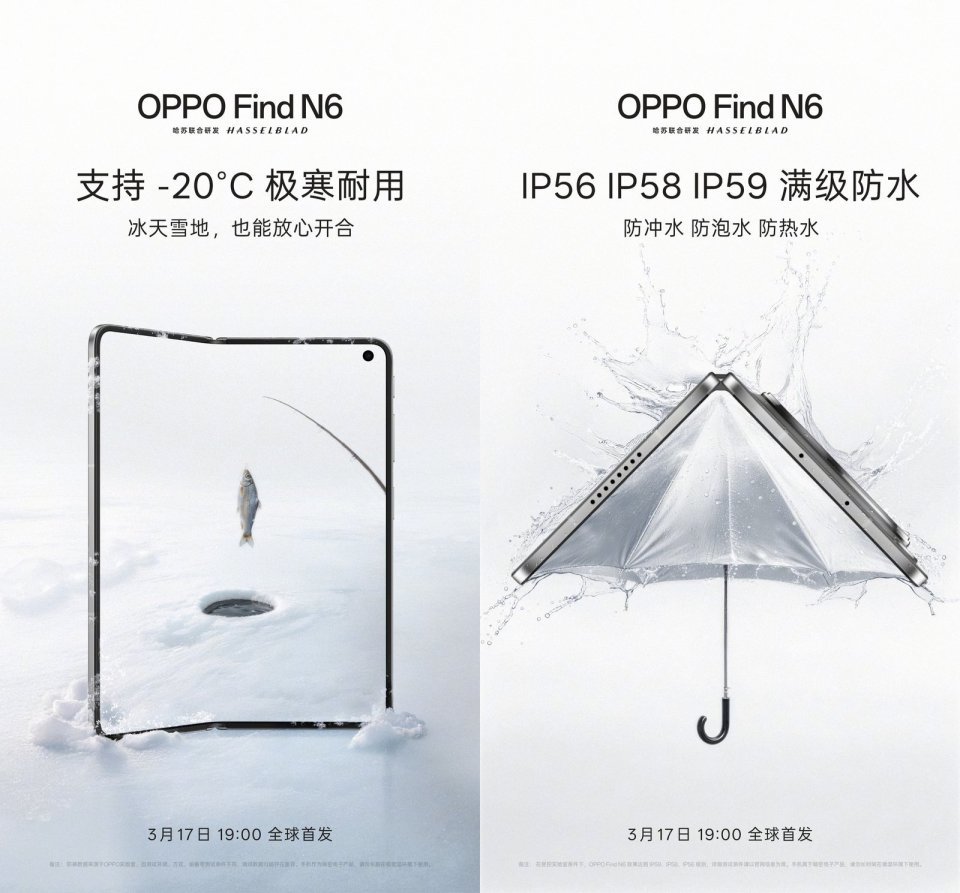 继在MWC2026上凭借几乎无折痕的表现,赢得了一众外媒和海外消费者的关注和热议之后,近日, @OPPO 也官宣了Find N6大折叠旗舰定档3月17日全球发布的消息。那么你以为这就完了吗?并没有。日前,官方再次发布预热消息公布,OPPO Find N6不但支持此前OPPO Find系列产品负责人 @OPPO周意保 展示的该机支持顶级防水,同时还拥有在-20℃极寒环境下耐用的特质。对于行业来说,这下“真没折”了。